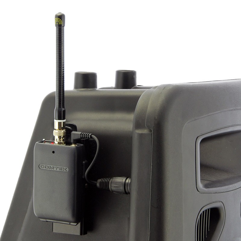 The COMTEK PR-216 Option P7 receiver is perfect for use as a "piggyback" receiver on powered speakers for remote speaker linkups and for field "point-to-point" RF links. This option makes it easy to achieve convenient speaker placement and on-location remote audio feed. In addition to a 9V battery, the receiver can be phantom-powered through the audio input jack.