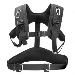 The PortaBrace AH-3HD is specifically designed to handle heavy loads, but can also be used without the padded waist strap when using medium or small sized audio setups. The large padded belt fastens tightly and comfortably around the users waist, and attaches to any bag's D-ring system using carabiners. By adjusting the chest and underarm straps, the user can easily lower and transfer the bags weight down to the hips, alleviating strain from the back and shoulders. The spinal strap can then be tightened to complete the setup. The low profile of the harness's padded foam material molds to your body and distributes the weight evenly, while keeping the bag securely in place.
