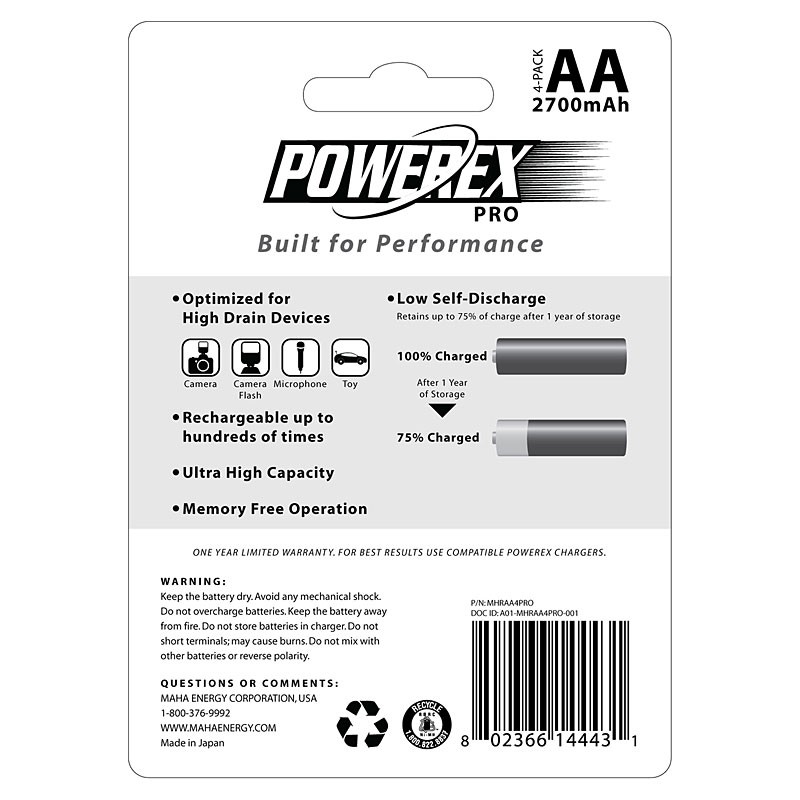 The MHRAA4PRO Powerex PRO Rechargeable AA NiMH Batteries (1.2V, 2700mAh) is a package of (4) AA nickel-metal hydride (NiMH) batteries with ultra high capacity of 2700mAh. These batteries are built for performance and optimized for high drain devices by providing increased run-time and improved low temperature performance down to -20°C. They can be recharged up to hundreds of times. The batteries are capable of being stored for an extended period of time and will retain up to 75% of their capacity after one year in storage. Battery carrying case included.