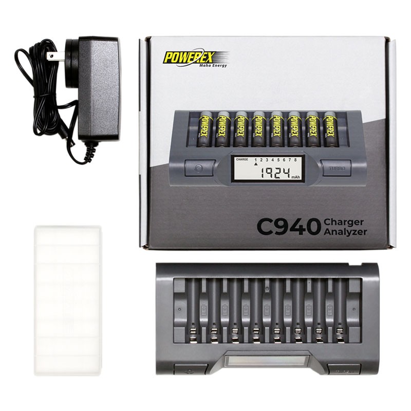 The Powerex MH-C940 Charger-Analyzer from Maha Energy charges up to eight AA or AAA nickel-metal hydride (NiMH) batteries independently. This versatile charger offers a Default Soft Mode, Turbo Mode, and Conditioning Mode. The Default Soft Mode prioritizes prolonging battery lifespan and charges batteries in as little as four hours to maximize battery life. The Turbo Mode accelerates the charging process twice as fast in two hours. The Conditioning Mode has a Deep Battery Conditioning System to rejuvenate older batteries with capacity readout. The charger's backlit LCD display offers convenient status monitoring and can be easily toggled On/Off as needed.