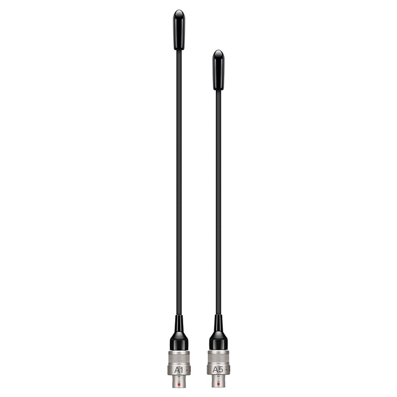 Replacement, detachable antenna with threaded coaxial connector for use with SK 6212, SK 6000 and SK 9000 wireless bodypack transmitters. Antennas are frequency-specific: Antenna A1 - A4 (470 - 558 MHz; 133 mm long) or Antenna A5 - A8 (550 - 638 MHz; 116 mm long).
