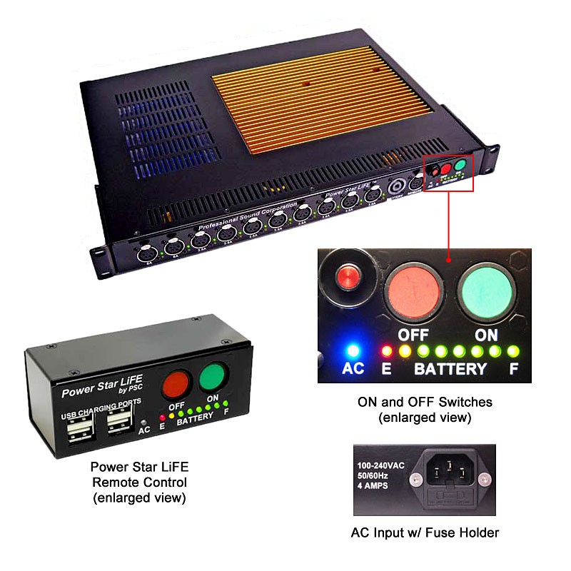 Remote Control Meter: Every PSC Power Star LiFE comes with a small remote control box. The use of the remote control allows the Power Star LiFE to be mounted down and out of the way on your sound cart, if desired. This remote contains an additional set of "On and Off" controls, an additional battery level meter and also four USB charging ports. The PSC Power Star LiFE can be operated with or without the remote control box.