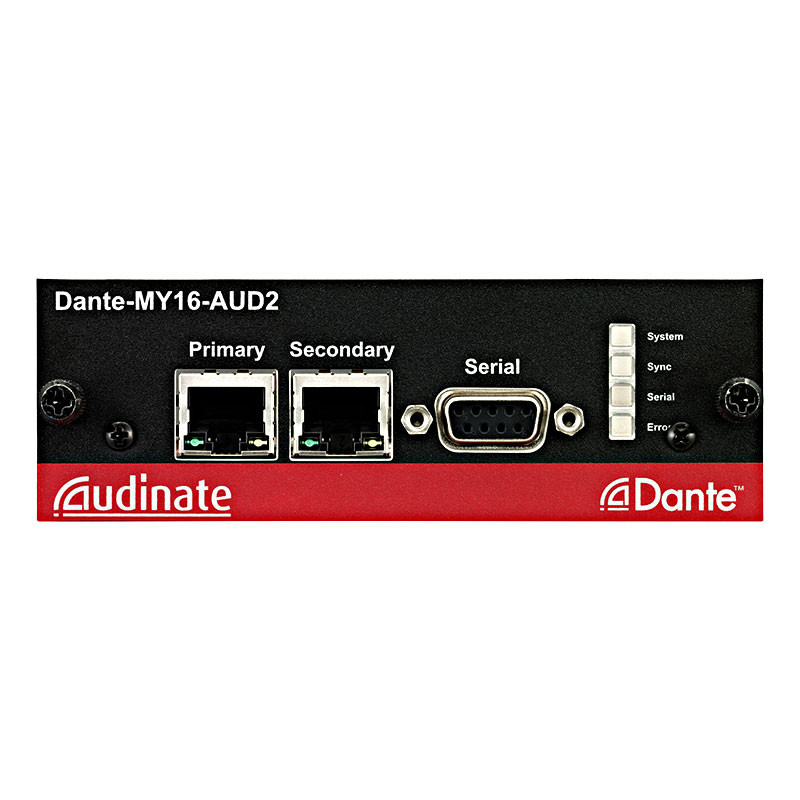 Each Dante-MY16-AUD2 provides up to 32 (16x16) channels at 44.1kHz or 48kHz, or 16 (8x8) channels at 88.2kHz or 96kHz, and full Dante network audio redundancy over Gigabit Ethernet. Add more cards to add more channels, and connect to other Dante-enabled audio equipment and to a PC or Mac running Audinate’s Dante Virtual Soundcard or Dante Via software for a complete audio networking solution.