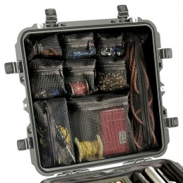 Designed specifically for the Pelican 0370 and 1640 series cases. Made of waterproof ballistic nylon. Large pockets with nylon zippers. Installs with included mounting screws. Size (L x W x D): 23.5 x 19.5 x 1 in