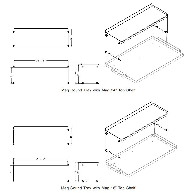 The MAG-F JR Magliner Top Sound Tray secures itself to right or left side of an 18" or 24" Mag Junior Top Shelf with hand prongs. The Sound Tray is fully collapsible.