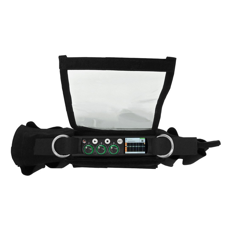 Side openings provide complete access to cable input / outputs and memory card slots. The openings seal tight with hook and loop fastener to provide maximum protection against water, dust and debris. The AR-MIXPRE3 also comes with a clear Vinyl cover that can be easily attached to allow an unobstructed view of the recorder's screen while protecting the Mix-Pre 3 from rain or splashing. There is a wireless transmitter pocket on each side of the case and molle strips along the front of the case to allow for more transmitters to be clipped (4 total). The AR-MIXPRE3 comes with the HB-15 Mini-DV Strap.