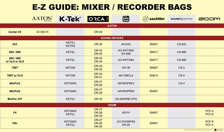 Enlarge above image to open as a PDF file. Then click on model numbers to link directly to our site. Otherwise, all can be found in the Bags & Harnesses » Mixer & Recorder Bags category.