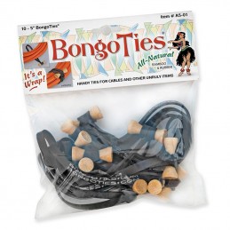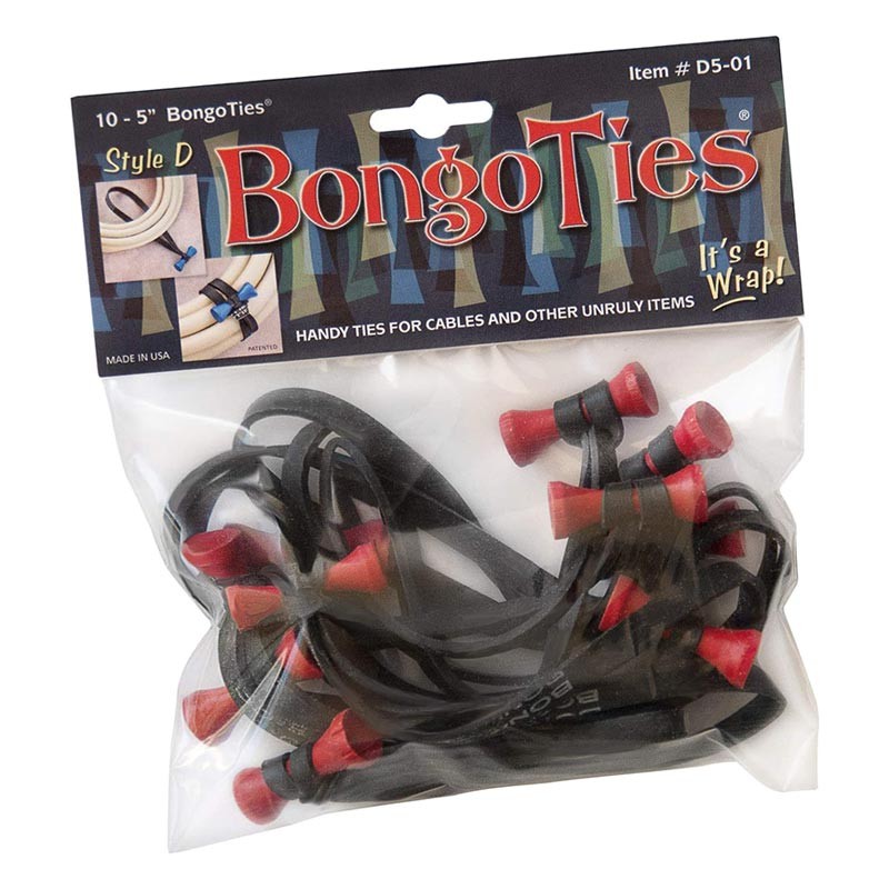 The minute you snap a BongoTie Cable Tie into place, you realize that you've discovered the very best way to fasten or organize all those unruly items in your life—photo, video, and sound cables, computer cables, extension cords, studio stuff, sports equipment, office and industrial items, you name it! This 10-pack of ties are reusable, and employ a patented "button-type" closure design for an easy application/removal. BongoTies are, sturdy, economical, and made of Hevea rubber (5" elastic) and bamboo. Available in Black with Natural Bamboo, All Red, and Red and Black Lava.