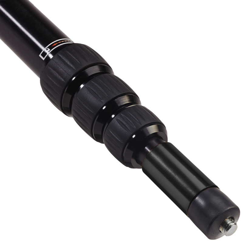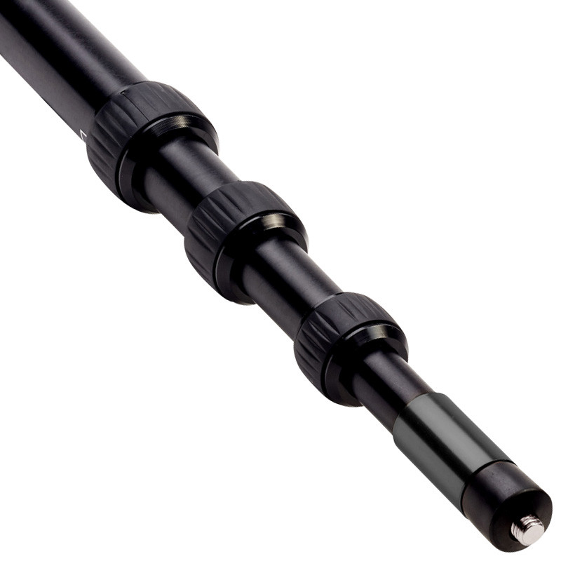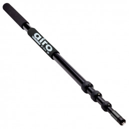 The Airo ABP1 Boom Pole 1 has a collapsed length of 3'2.5" (98 cm), an extended length of 10'10" (330cm), and only weighs 1.6 lbs (735 g). This uncabled aluminum boom pole features four non-rotational sections. The top attachment is a 3/8"-16 male thread and the bottom attachment is made of anodized aluminum, both of which are removeable. Rubberized collars easily lock and unlock with minimal twist movements. Foam grips reduce handling noise and offer comfort during longer takes.
