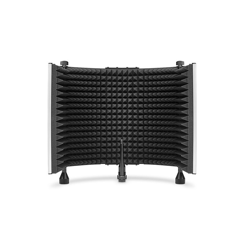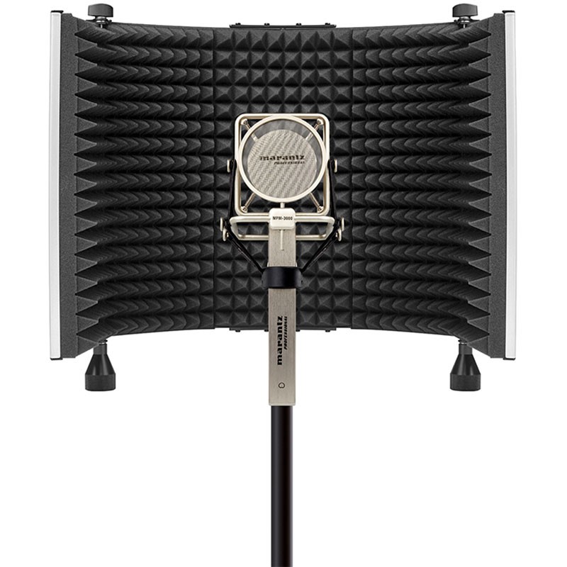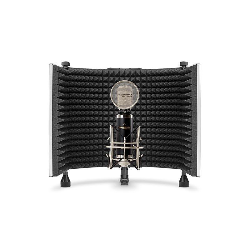 The Marantz Sound Shield is a professional vocal reflection filter perfectly sized for any studio space. It shields the recording microphone from those distracting acoustic artifacts, creating a cleaner, more focused, more intelligible recording. Sound Shield has five absorptive walls (three stationary, two foldable) consisting of sculpted sound-absorptive surfaces, backed by high-density EVA foam for additional sound attenuation. It can be custom-shaped around the microphone to create a very focused, precise recording in any environment.