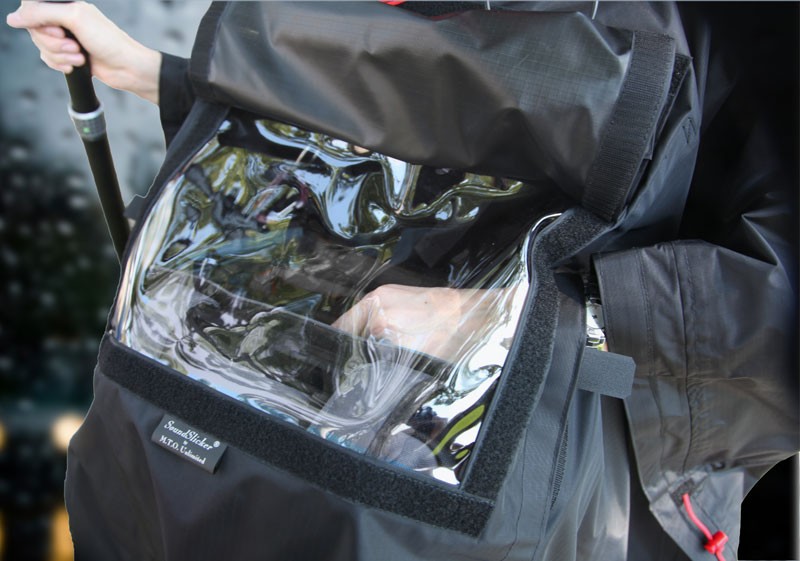 Designed with both the soundperson and cameraperson in mind, this poncho has safety in mind—first and foremost. The front has a removable roll-up flap which then reveals a clear viewing panel so you can see your gear. A vent in the back allows air to circulate and humidity to escape. A tie around the waist lets you secure the poncho in a gale.