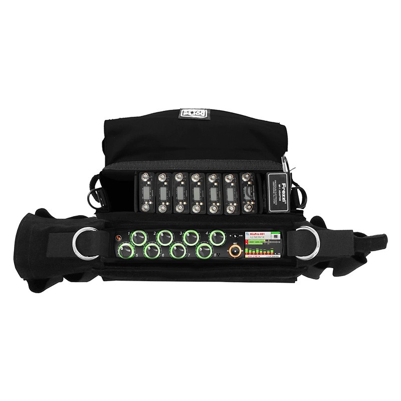 There is a wireless transmitter pocket on each side of the case and MOLLE (Modular Lightweight Load-carrying Equipment) strips along the front of the case to allow for more transmitters to be clipped (4 total). It comes with the HB-15 Comfortable Nylon Shoulder Strap.