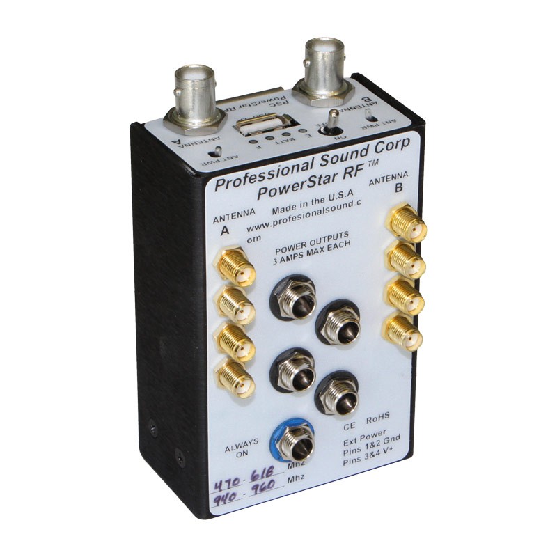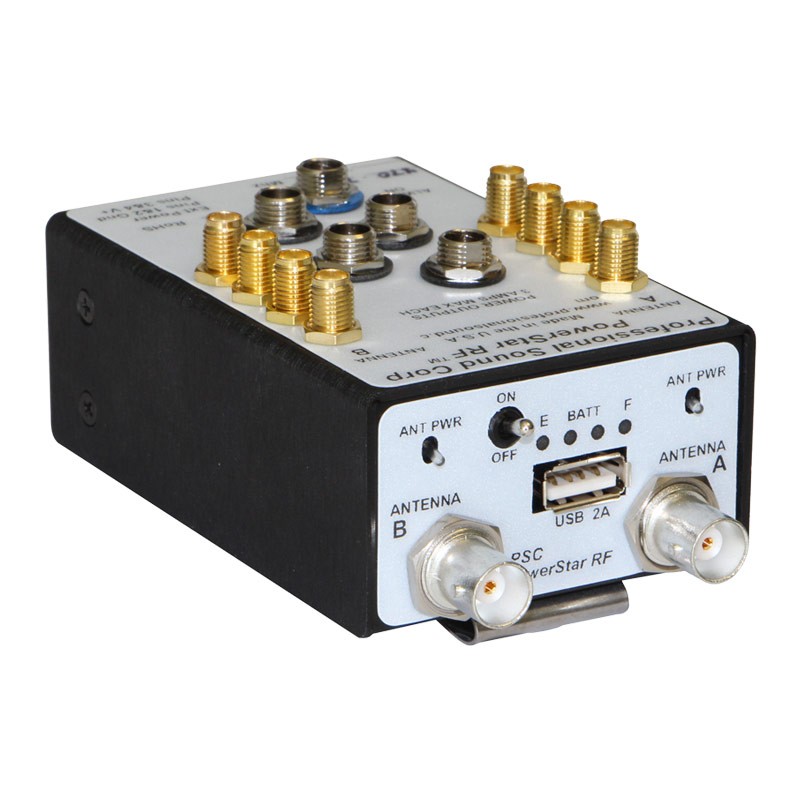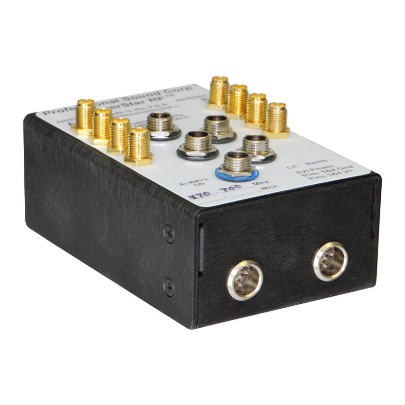 The PSC PowerStar RF has a built in power distribution system with dual external DC inputs allowing the use of two batteries or a battery and an AC power supply. It also has a built in diversity RF antenna distribution system. Each half of the RF distribution system offers an active 1x4 RF splitter. You can use this system to feed up to four diversity receivers from one diversity set of receiver antennas. This compact, rugged device was developed using the latest super low noise, high current RF amplifiers and will operate over various frequency ranges based on which bandpass filter the unit is built with. Its two inputs are traditional BNC connectors for ease-of-use in interfacing with your external antennas. It will also provide individually switched DC power to supply remote powered antennas and remote RF amplifiers.