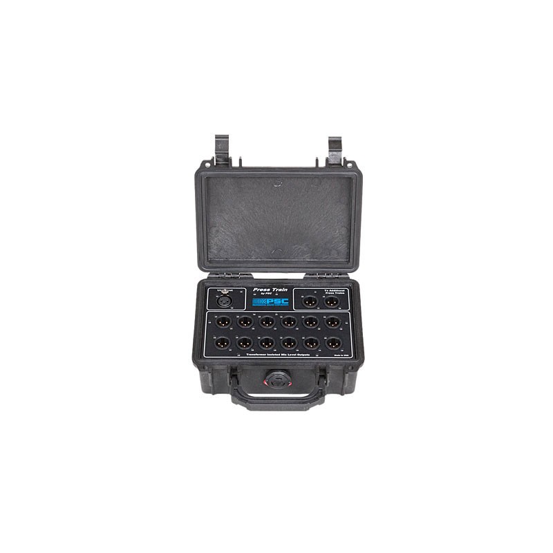 The Press Train is a compact and easy to use in the field. It serves as a one input, 12 output passive audio distribution box designed to feed high quality audio for press conferences. This ruggedly built device is housed in a waterproof Pelican 1120 case for ease of use and shipping. The Press Train can be used in conjunction with the PSC Press Bridge or with any professional balanced line level source. Its input accepts a standard +4dBm balanced line level signal and provides 12 transformer isolated microphone level outputs. Its custom-wound, mu-metal-shielded transformer’s high input impedance ensure that up to 8 Press Trains can be connected to any professional 600 ohm balanced line without excessive line loading or distortion. Thus, you can obtain 96 separate, transformer-isolated, microphone-level outputs from a single line level source. Up to 300 outputs can be created with a Press Bridge and 24 Press Trains.